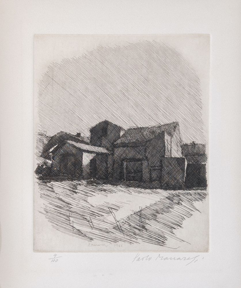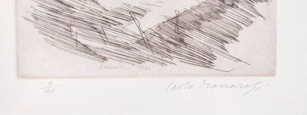 PAOLO MANARESI (Bologna 1908 - 1991) "Senza titolo", 1968. Acquaforte su carta. Lastra: cm 18,3x15. Opera firmata in basso a destra Paolo Manaresi. Reca numero di tiratura in basso a sinistra 9/100. Su lastra reca firma e data P. Manaresi 1968.