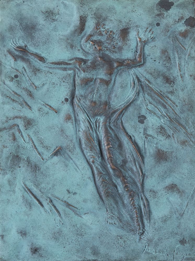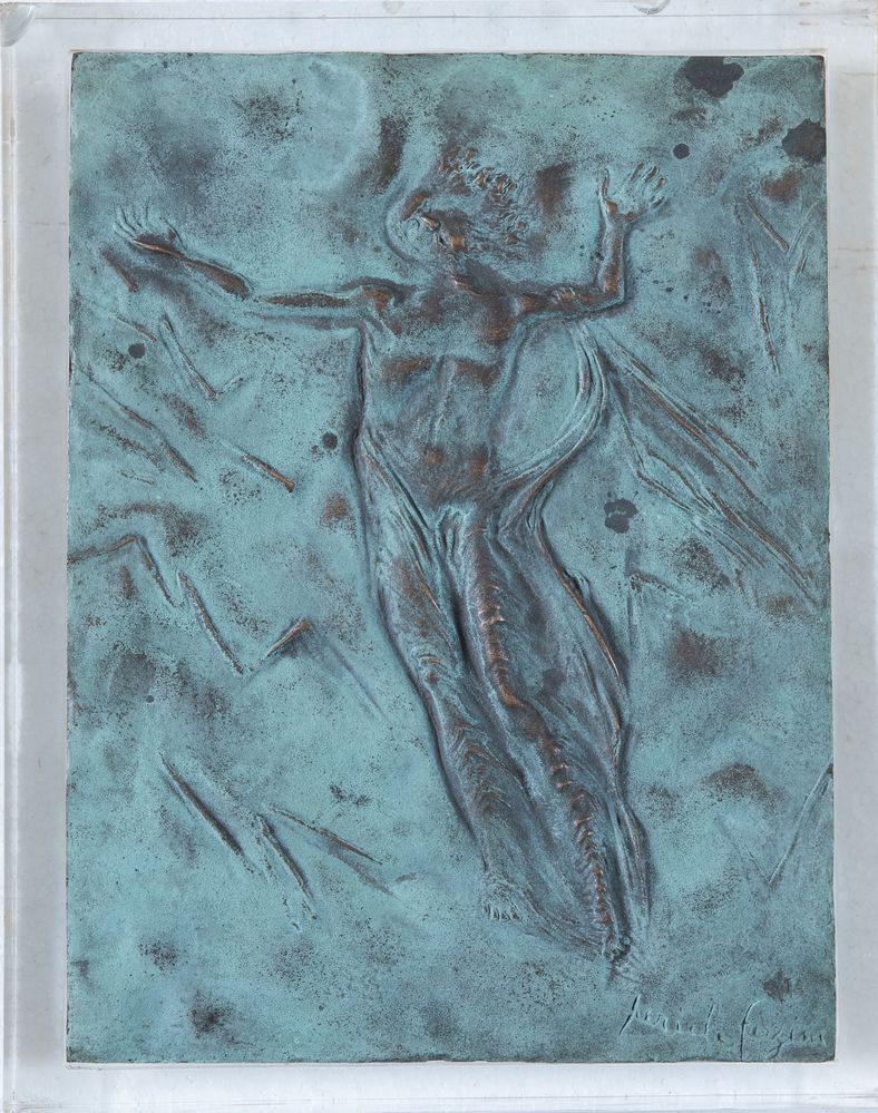 PERICLE FAZZINI (Grottammare 1913 – Roma 1987) “Resurrezione”. Bassorilievo in bronzo. Cm 31x23,5. Opera firmata in basso a destra Pericle Fazzini. Reca numeri di tiratura in basso a destra 9/16. Opera entro teca in plexiglass.