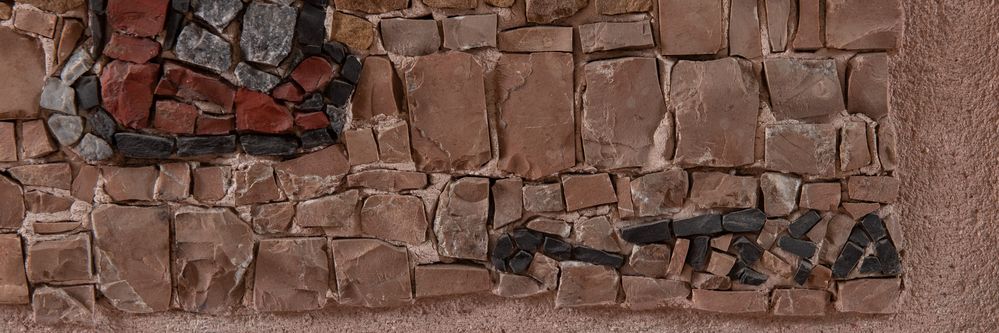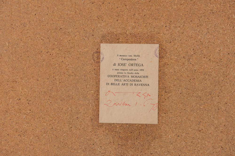 JOSE’ ORTEGA (Arroba de los Montes 1921 - Parigi 1990) “Campesinos”, 1978. Mosaico. Cm 70x70. Opera firmata in basso a destra a mosaico Ortega. Al retro reca etichetta con timbro della Cooperativa mosaicisti dell’Accademia di Belle Arti di Ravenna. Al retro opera firmata e datata Ortega, Ravenna, 1978.