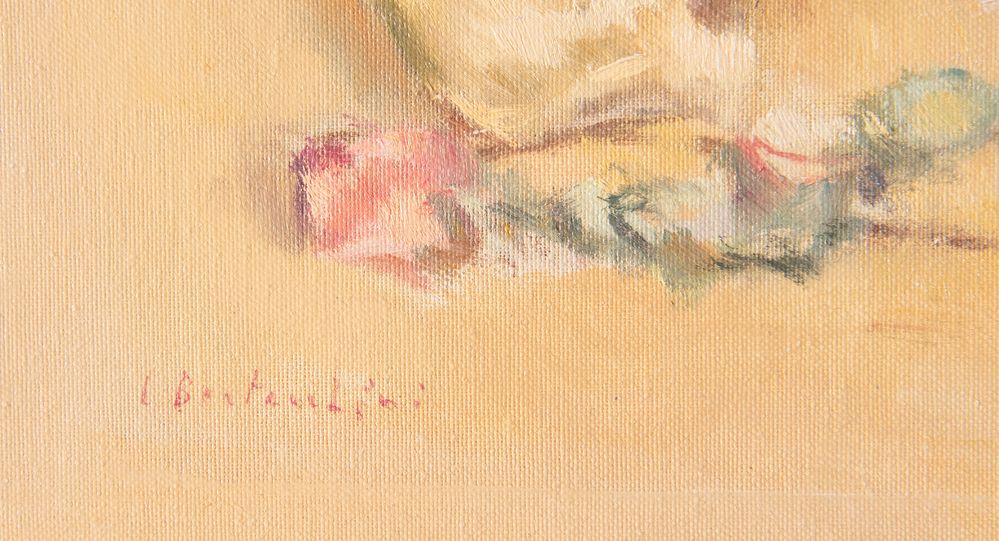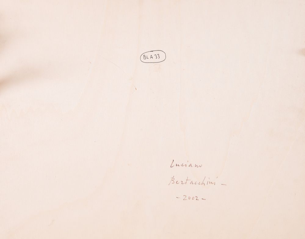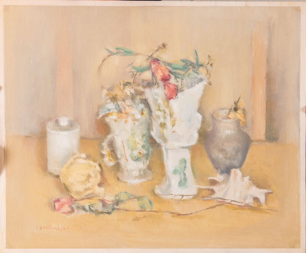 LUCIANO BERTACCHINI (Bologna 1913 - 2010) "Natura morta". Olio su tela applicata su tavola. Cm 43,5x53,5. Opera firmata in basso a sinistra L. Bertacchini. Al retro opera firmata e datata Luciano Bertacchini 2002. Al retro reca probabile numero di archiviazione BLA33.