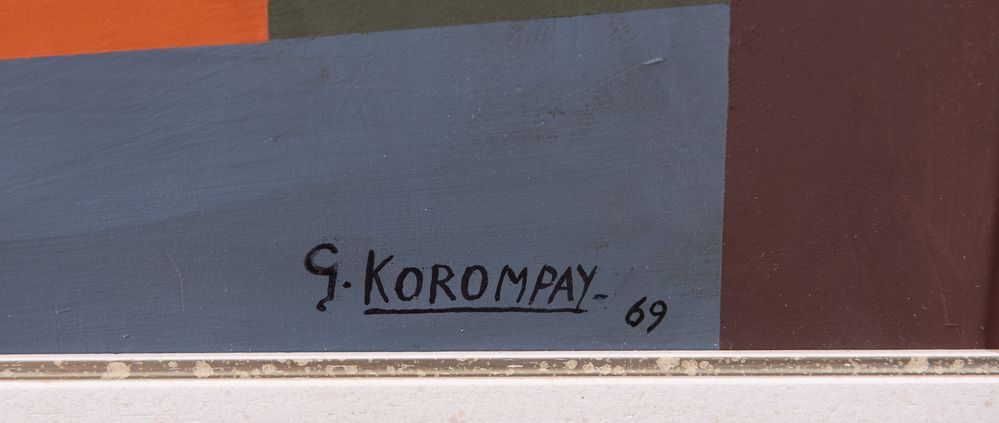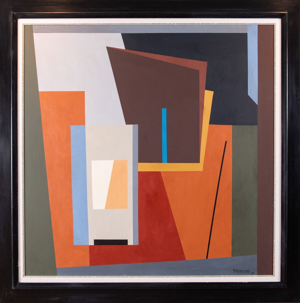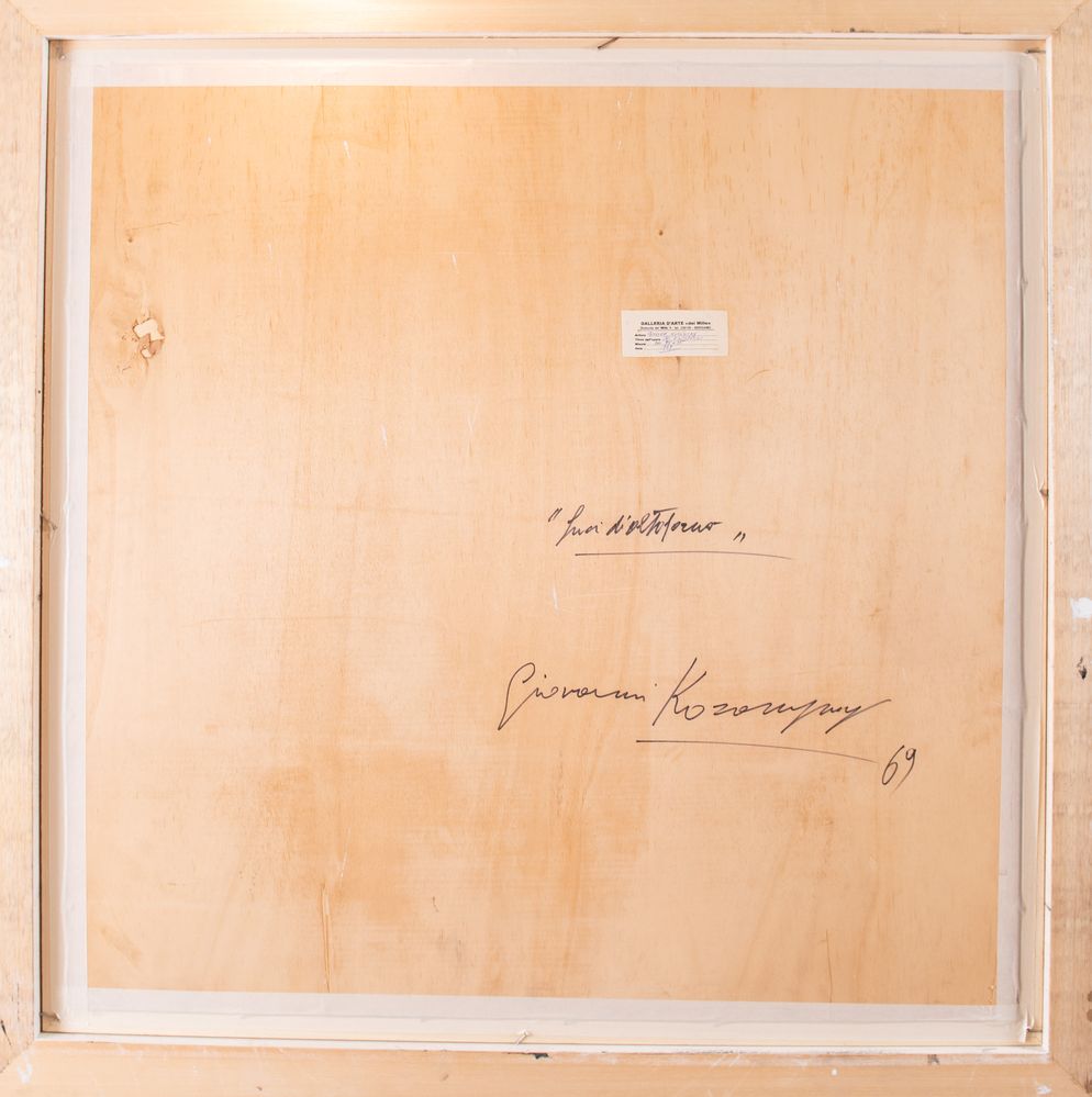 GIOVANNI KOROMPAY (Venezia 1904 - Rovereto 1988) "Luci d'altoforno", 1969. Olio su tavola. Cm 95x95. Opera firmata e datata in basso adestra G. Korompay 69. Al retro opera firmata, intitolata e datata G. Korompay 69 Luci d'altoforno. Al retro reca etichetta della Gallerai d'Arte dei Mille, Bergamo. Opera accompagnata da autentica con firma del maestro in data 11/07/1980.