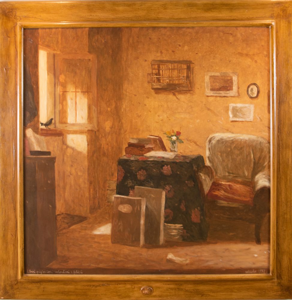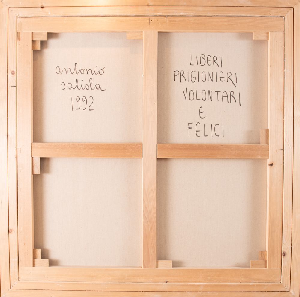 ANTONIO SALIOLA (Bologna 1939) "Liberi prigionieri volontari e felici", 1992. Olio su tela. Cm 100,4x100,4. Opera firmata e datata in basso a destra Saliola 1992. Al retro opera firmata, intitolata e datata Antonio Saliola Liberi prigionieri volontari e felici 1992.