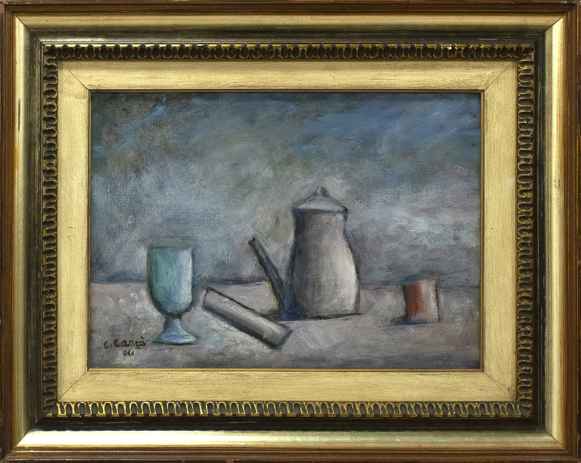 Carlo Carrà, Natura Morta, 1966, olio su tela, cm 35x50. Autentica Galleria La Barcaccia 1969 - Salso Maggiore Terme. Provenienza Galleria Annunciata Pubblicato su Vol. III Catalogo generale pag.561; rivista Biblioteca di via Senato -Novembre 2019.