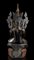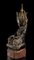 La figura seduta a gambe incrociate su piedistallo a sezione sagomata, il braccio destro disteso lungo il fianco con le dite rivolte verso il basso nel gesto di “toccare la terra” (bhumisparsamudra), il braccio sinistro piegato al gomito e la mano posata in grembo con il palmo aperto rivolto verso l'alto (in origine probabilmente a sostenere un contenitore, attributo tipico del cosiddetto Buddha della Medicina), la veste decorata a rilievo con motivi floreali, la testa sormontata da esuberante corona con motivi lanceolati e fiammeggianti.