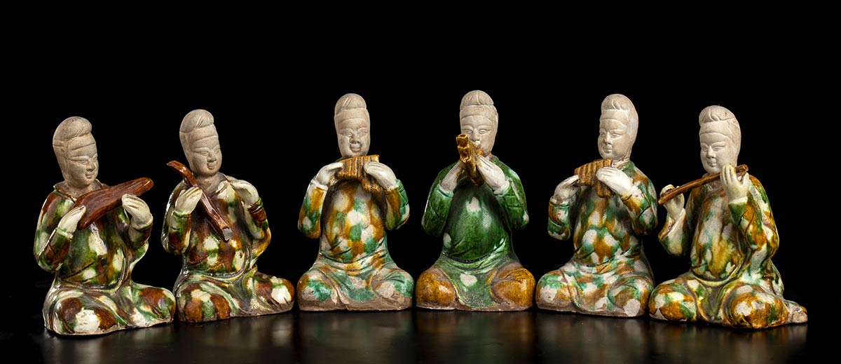 <br>SEI SCULTURE DI MUSICISTI SEDUTI IN CERAMICA CON INVETRIATURA SANCAI<br>Cina, XX secolo