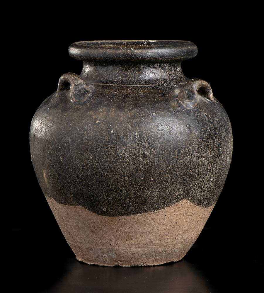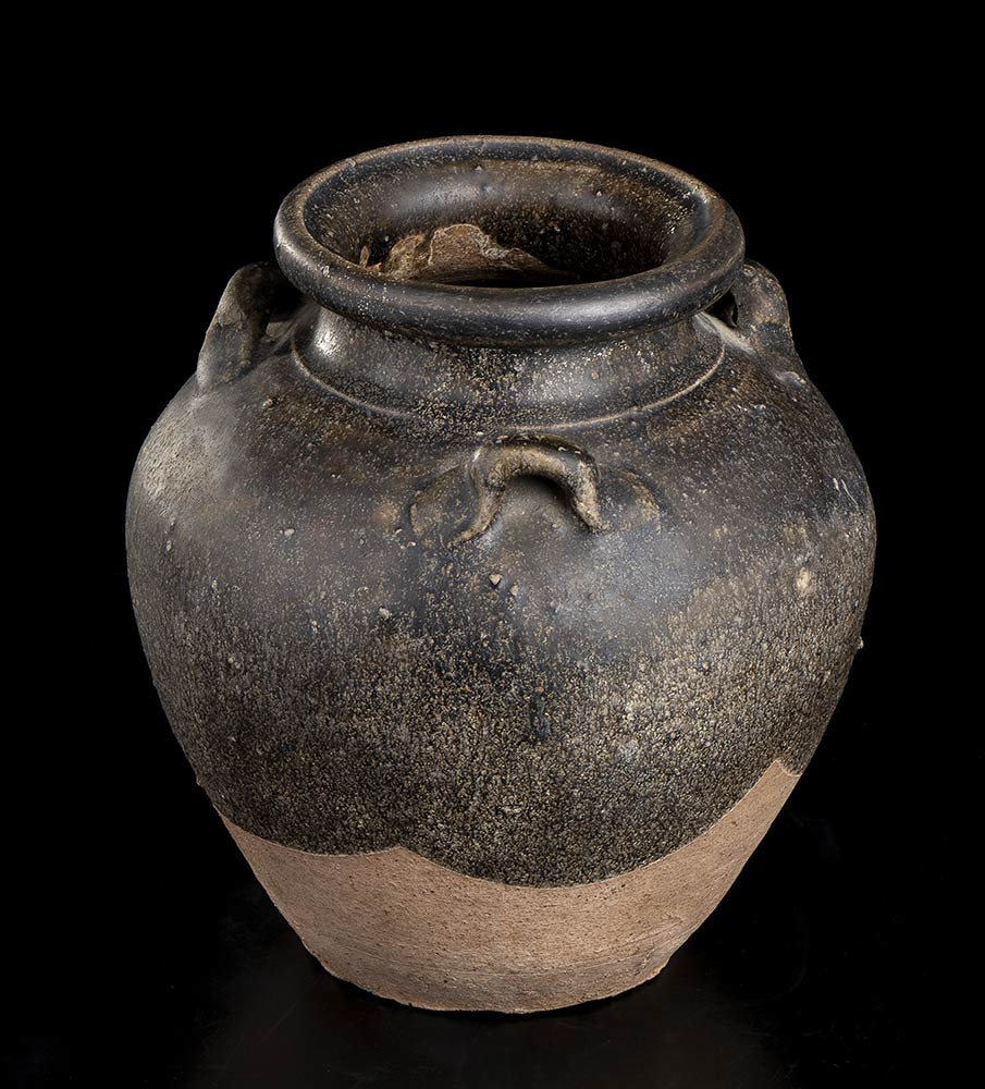 Corpo globulare e breve collo cilindrico con piccole anse ad anello sulla spalla, l'esterno con invetriatura marrone.