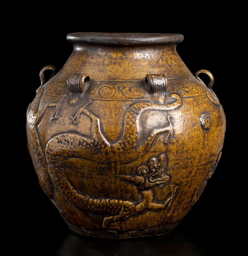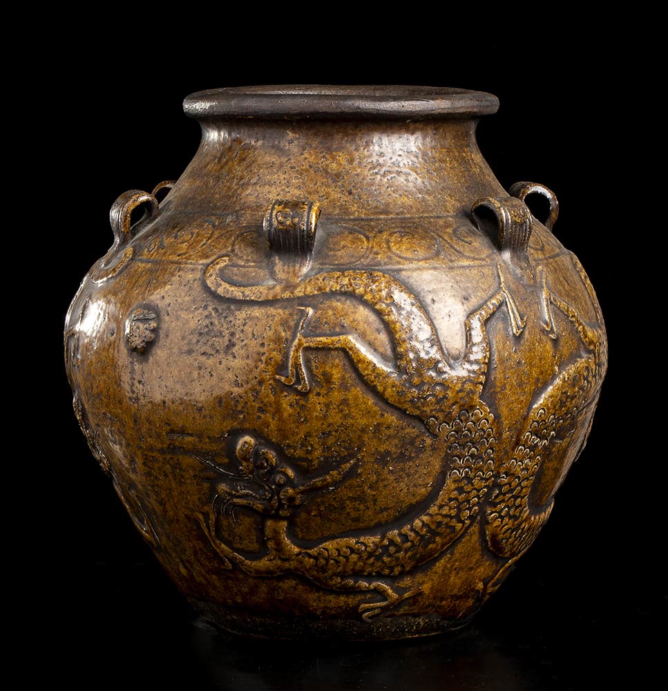 <br>GIARA IN CERAMICA MARTABAN CON INVETRIATURA OCRA<br>Cina, probabilmente dinastia Ming