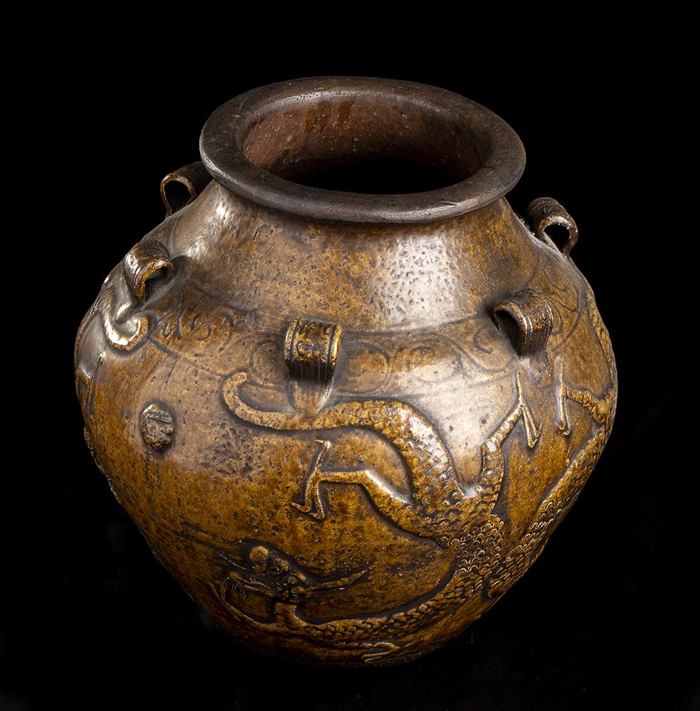 Corpo globulare e bocca sottolineata da bordino, sulla spalla una serie di piccole anse ad anello, la decorazione a rilievo con draghi.