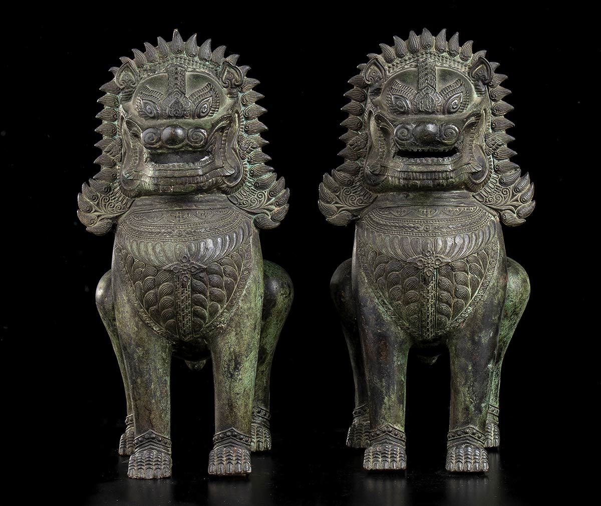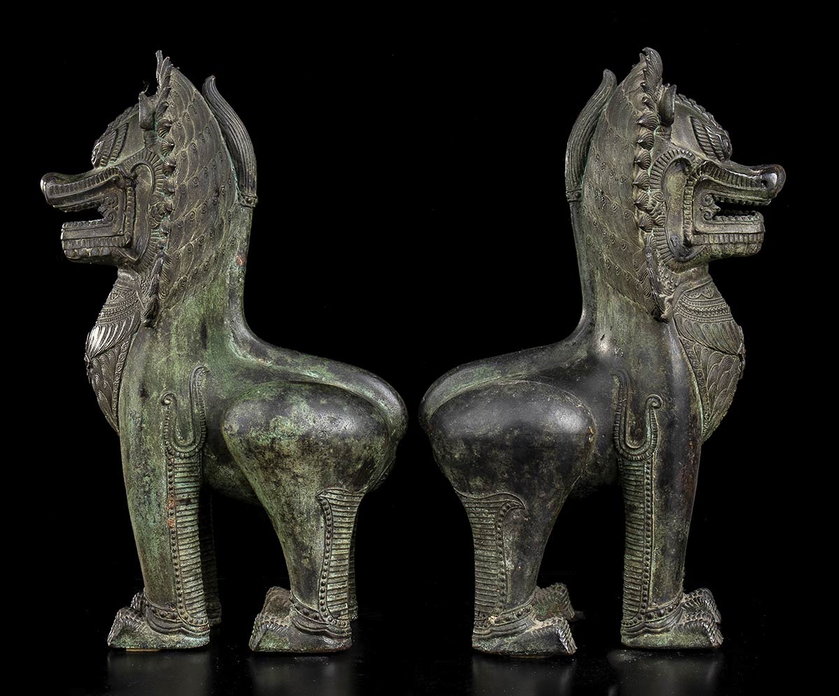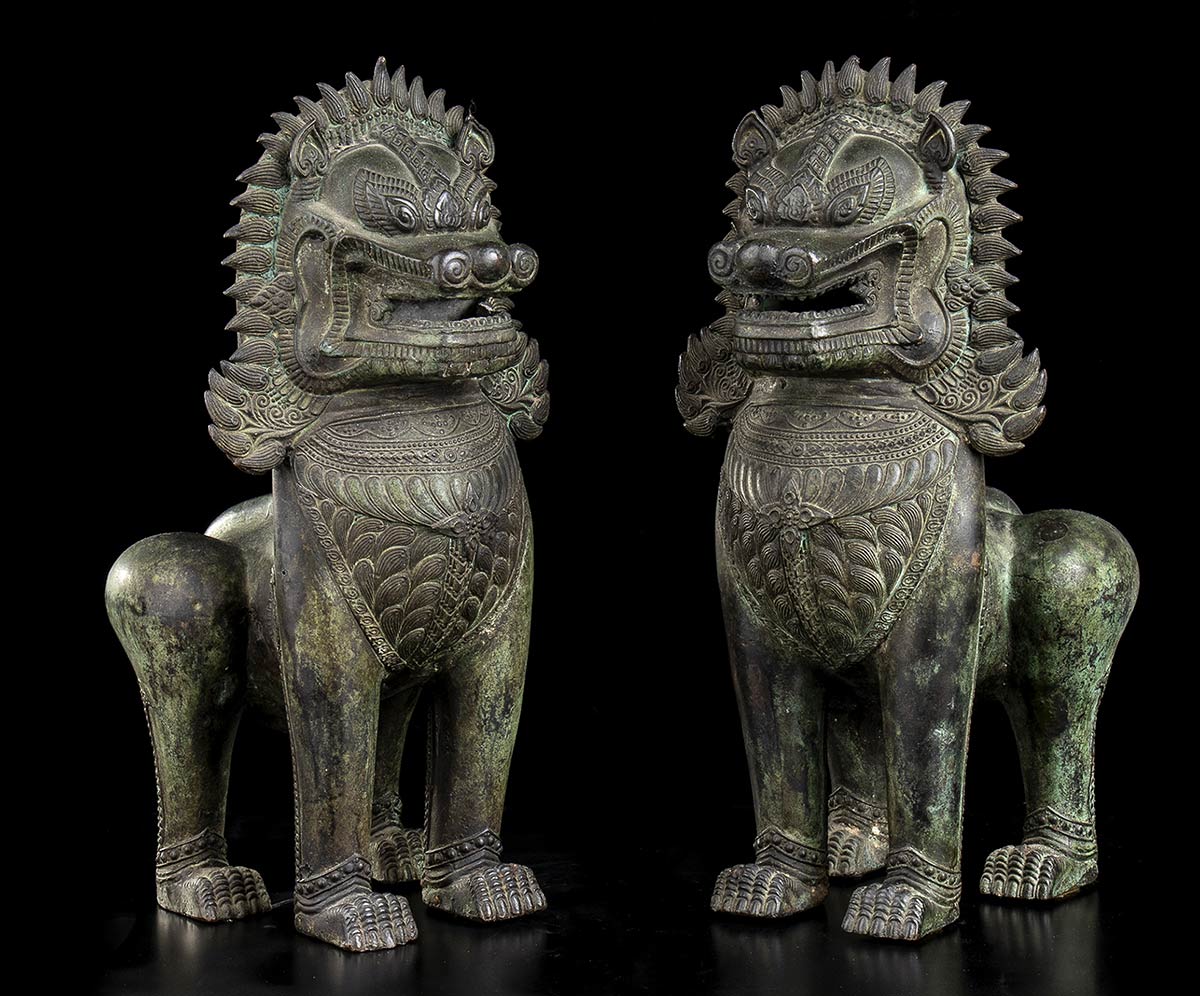 COPPIA DI LEONI BUDDHISTI IN BRONZO DI STILE KHMER