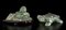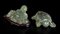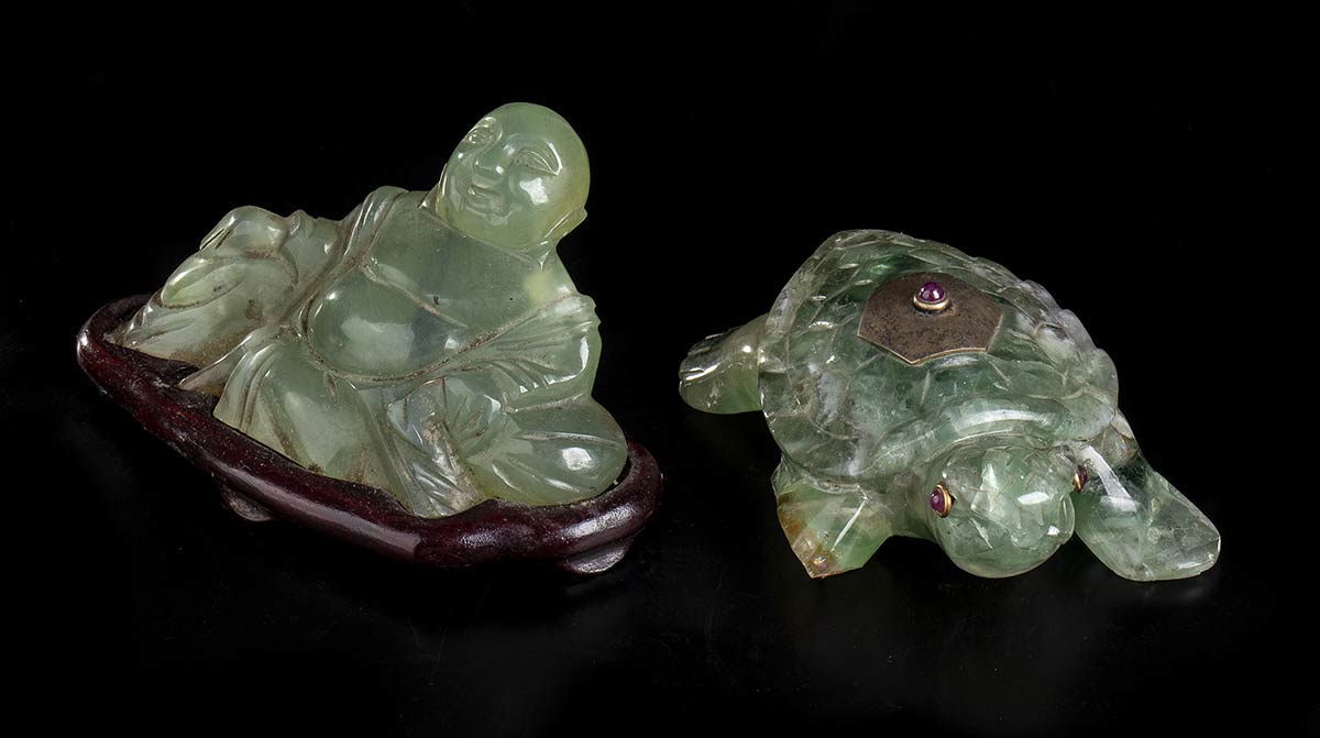 Una raffigurante Budai seduto su base in legno, l'altra una tartaruga con inserti di pietre rosse.