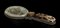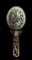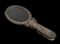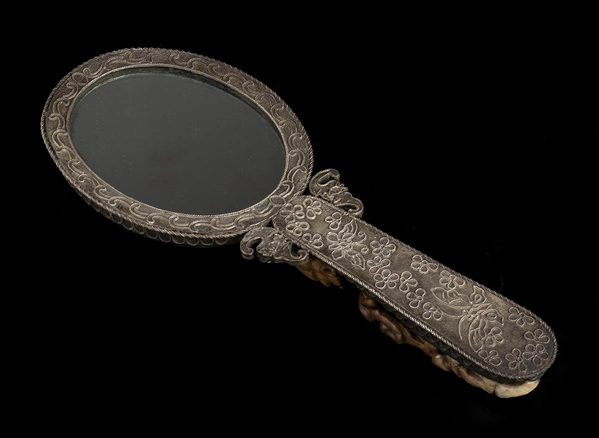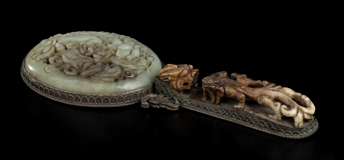 Specchio in argento con placca ovale in pietra con motivo di uccelli tra fiori di loto, sull'impugnatura fibbia in pietra saponaria con drago chilong.