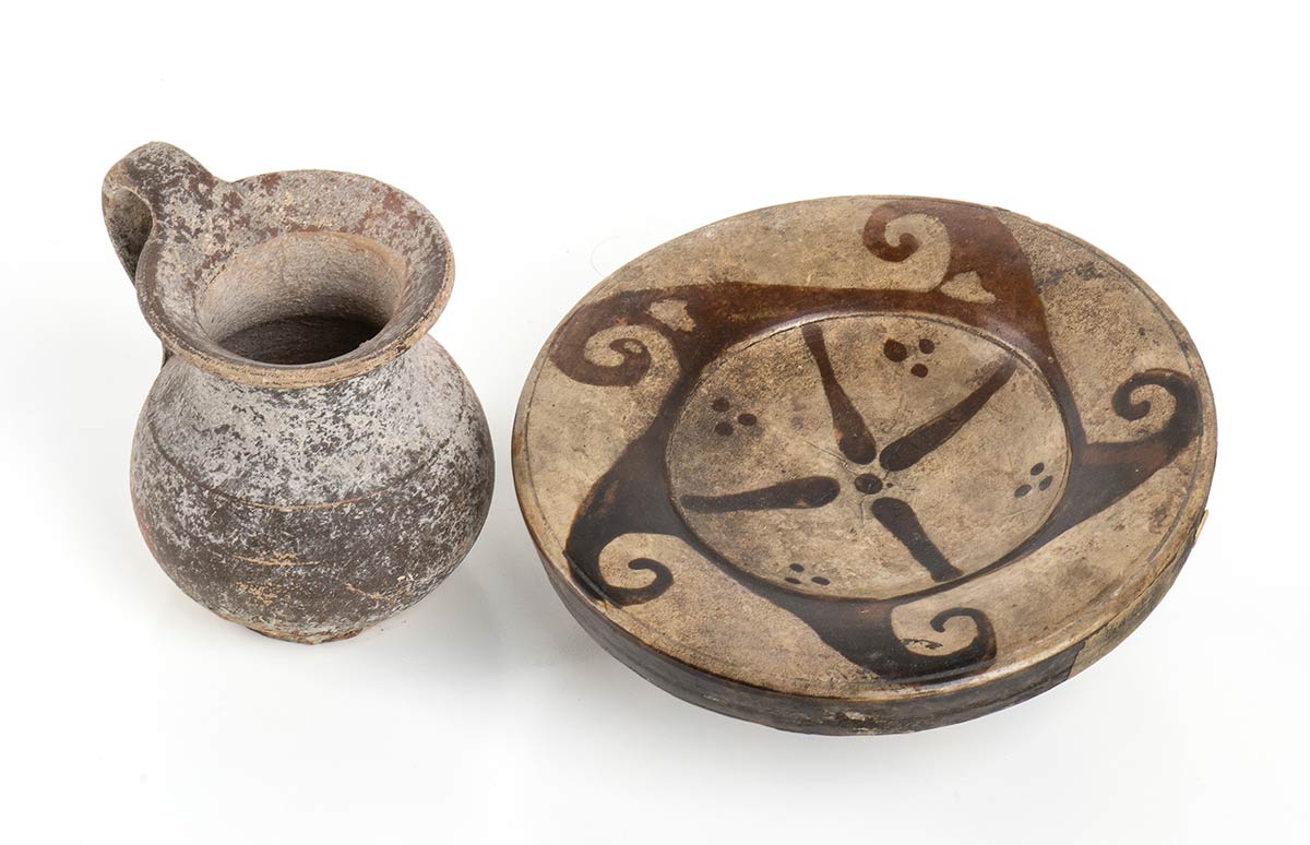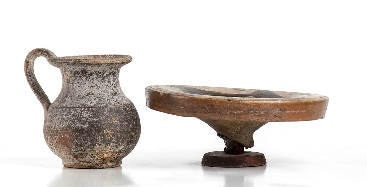 Coppia costituita da una brocchetta a vernice nera e dalla vasca di un piattello di Genucilia decorato nel centro con motivo a stella.