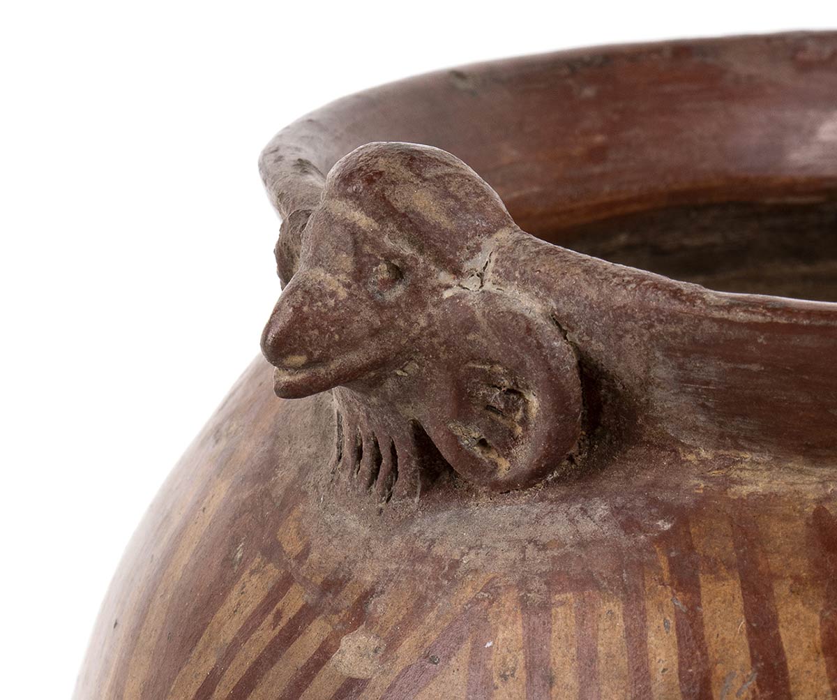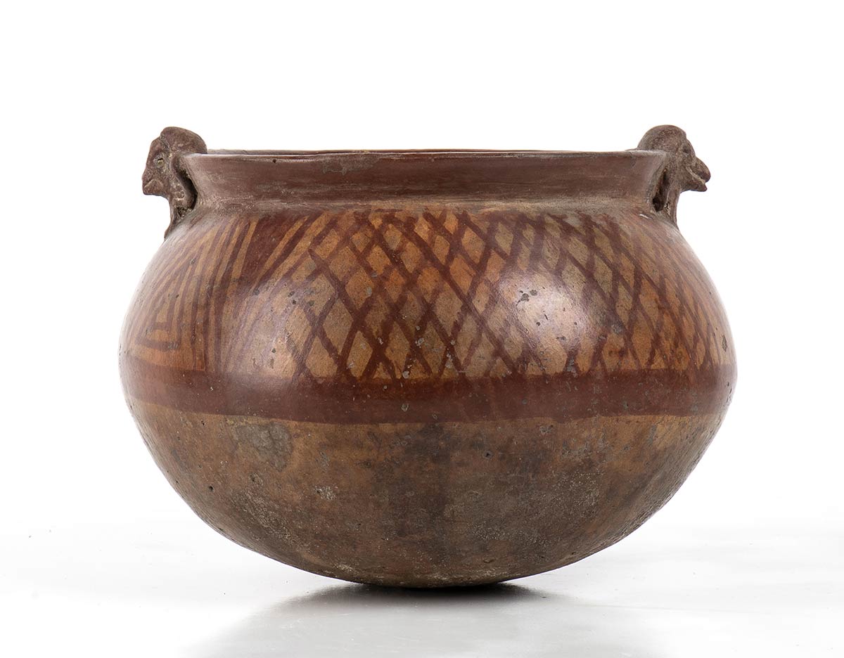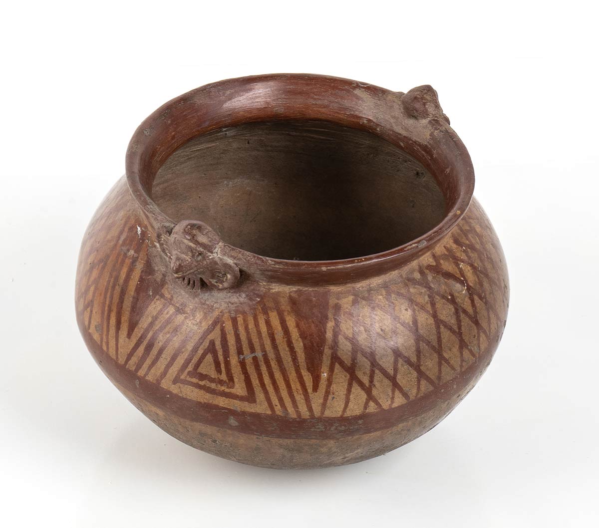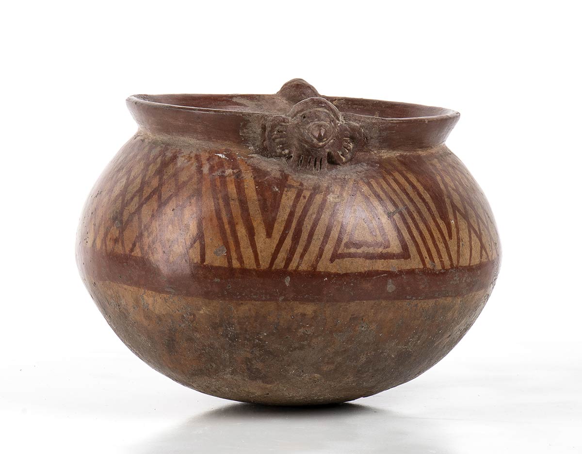 <br>OLLA POLICROMA CON PROTOMI PLASTICHE<br>Messico, Area di Michoacán de Ocampo<br>alt. cm 14; diam. cm 14,5<br><br>Intatta.<br><br>Dalla collezione di Maria Pia e Amintore Fanfani.