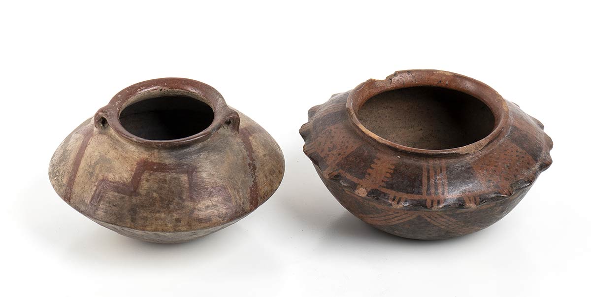 <br>COPPIA DI OLLE BICONICHE POLICROME<br>Messico, Area di Michoacán de Ocampo<br>alt. massima cm 10,5<br><br>Sbaccature sparse.<br><br>Dalla collezione di Maria Pia e Amintore Fanfani.