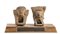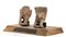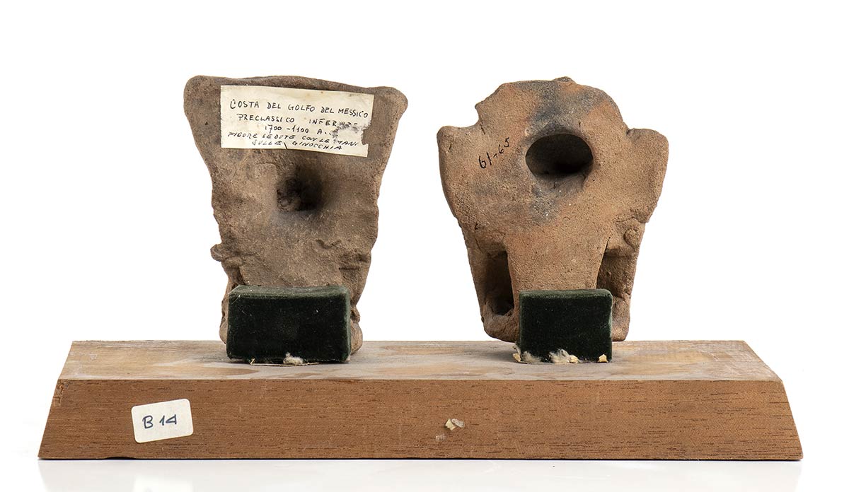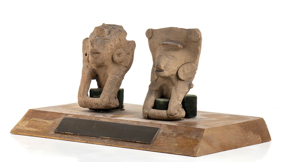 <br>COPPIA DI STATUETTE IN TERRACOTTA<br>Messico, Cultura di Tlatilco<br>alt. cm 12 l'uno; base di cm 29 x 16,5<br><br>Intatte, montate su base in legno con targa in ottone