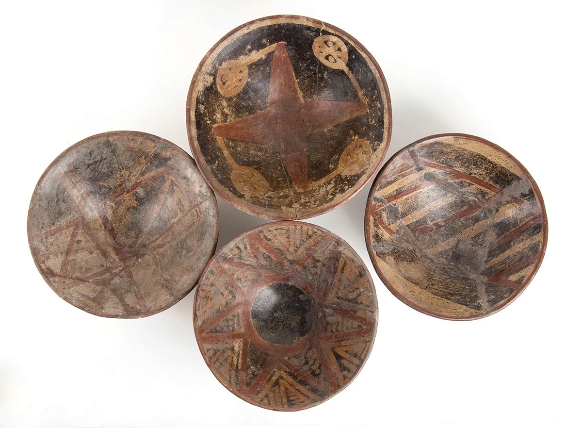 <br>GRUPPO DI QUATTRO CIOTOLE POLICROME<br>Colombia, Area di Nariño<br>diam. cm 20 - 22<br><br>Restauri ricostruttivi e integrativi sparsi.<br><br>Dalla collezione di Maria Pia e Amintore Fanfani.