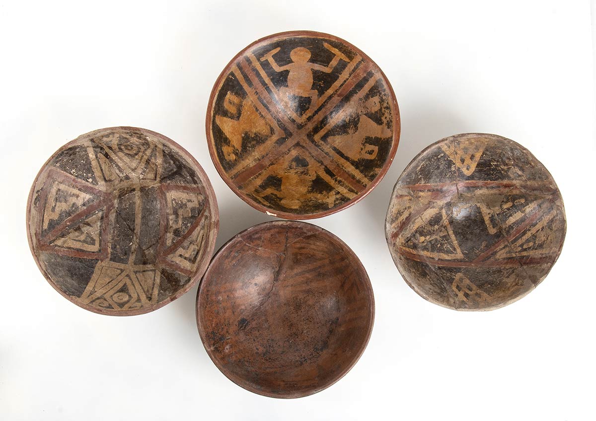 <br>GRUPPO DI QUATTRO CIOTOLE POLICROME<br>Colombia, Area di Nariño<br>diam. cm 20 - 22<br><br>Restauri ricostruttivi e integrativi sparsi.<br><br>Dalla collezione di Maria Pia e Amintore Fanfani.