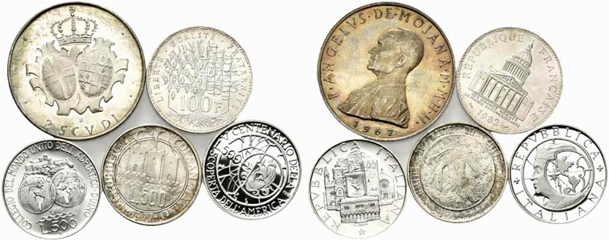 Lotto di 5 monete in argento (san Marino 500 lire 1977, Repubblica Italiana 500 lire 1985 e 1990, Francia 100 franchi 1982, SMOM 2 scudi 1967). FDC