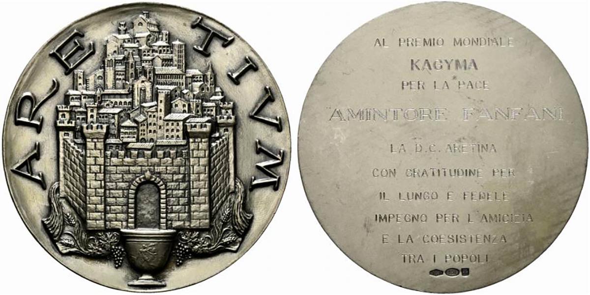 AREZZO. Medaglia al premio mondiale Kagyma per la pace Amintore Fanfani. D/ARETIVM; veduta della città di Arezzo. Ag (247 g - 79,8 mm). FDC