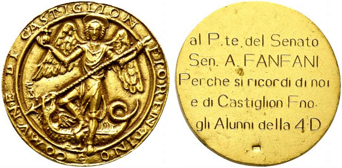 <br>CASTIGLION FIORENTINO. Medaglia nominativa al Presidente del Senato A.Fanfani dagli alunni della 4aD. AE dorato (65,18 g - 48 mm).