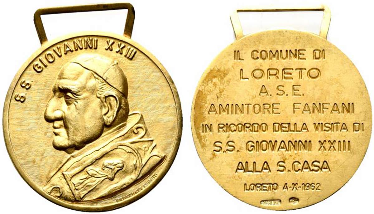 <br>LORETO. Medaglia 1962 nominativa Amintore Fanfani in ricordo della visita di S.S.Giovanni XXIII alla S.Casa. AE dorato (17,9 g - 35 mm).