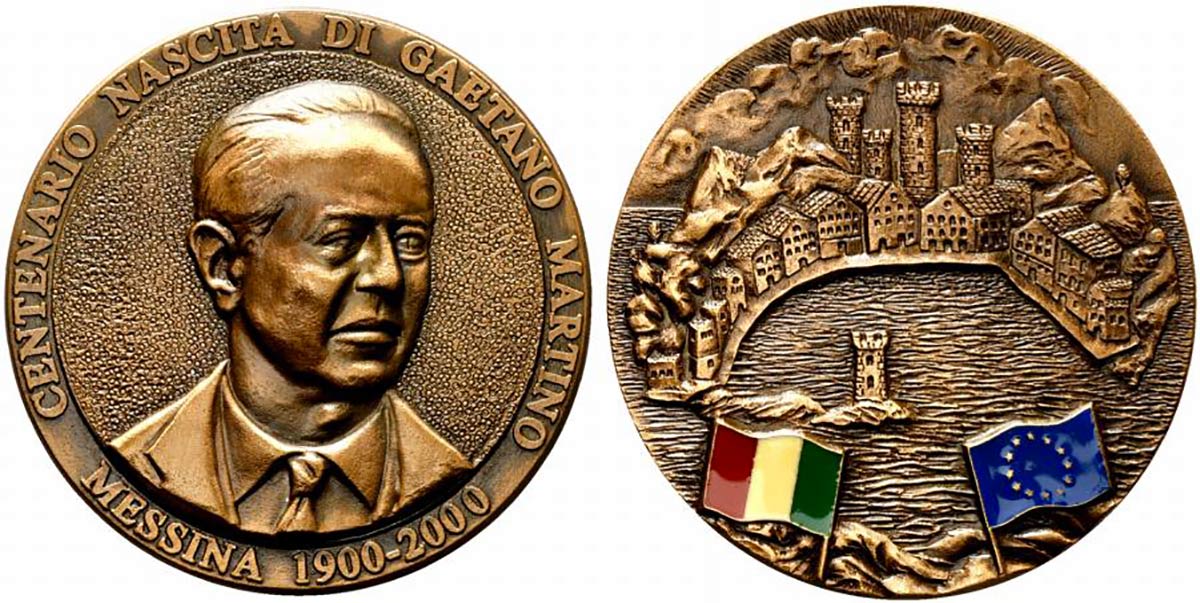 MESSINA. Gaetano Martino (scienziato, statista, pioniere dell'Europa Unita). Medaglia centenario della nascita. AE (237 g - 70 mm). R/la città di Messina (miniatura artistica XVI sec.), in basso bandiere smaltate dell'Italia e dell'Unione Europea. FDC con cofanetto.