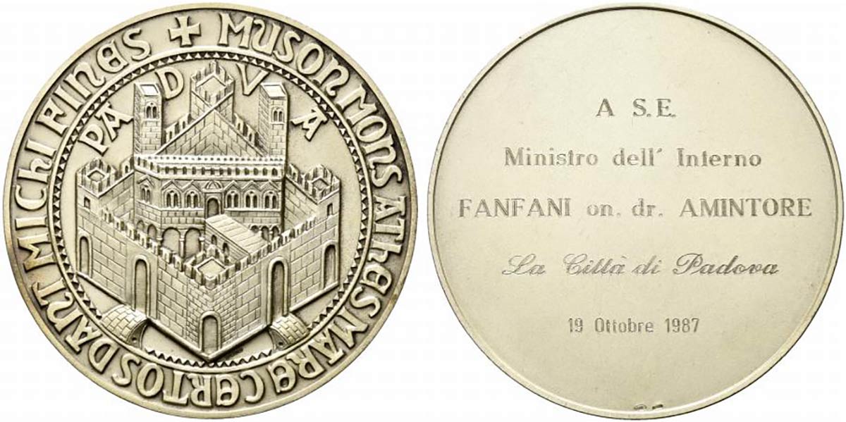 <br>PADOVA. Medaglia 1987 La città di Padova a S.E. Ministro dell'Interno Amintore Fanfani. Ag (252 g - 80 mm) Opus Lorioli. FDC