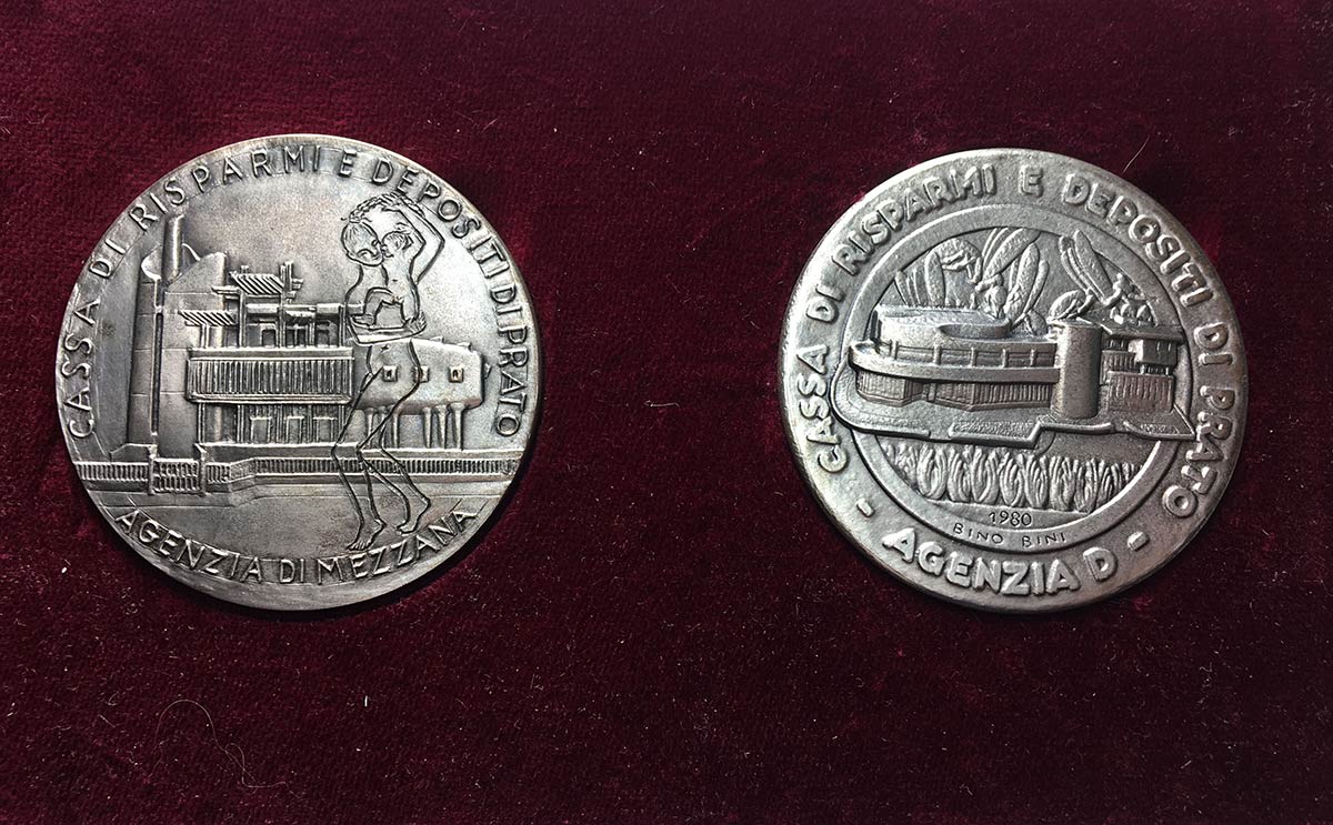 <br>PRATO. Cassa di Risparmio e Depositi. Dittico 1980 di medaglie dei soci fondatori (Gaetano Magnolfi e Giovan Battista Mazzoni). Ag (95 g - 55 mm cad.). FDC.