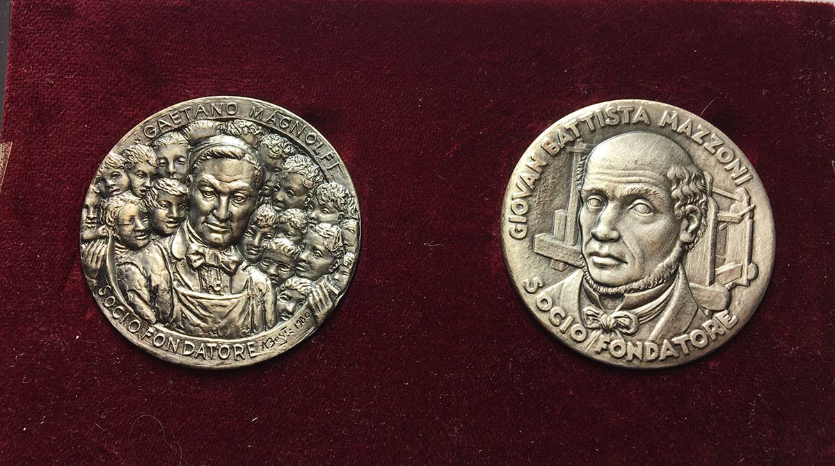 PRATO. Cassa di Risparmio e Depositi. Dittico 1980 di medaglie dei soci fondatori (Gaetano Magnolfi e Giovan Battista Mazzoni). Ag (95 g - 55 mm cad.). FDC.