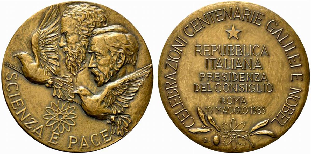 REPUBBLICA ITALIANA Presidenza del Consiglio 1983. Medaglia Celebrazioni Centenarie Galilei e Nobel. Scienza e Pace. AE (104 g - 66 mm) Opus Cretara. FDC