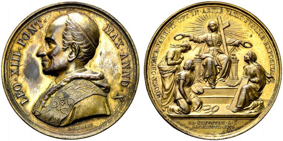 <br>ROMA. Leone XIII (1878-1903). Medaglia Esposizione Artistica in Vaticano 1887 anno X. AE dorato (32 g - 43,5 mm). Modesti 152. BB