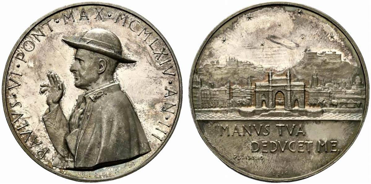 ROMA. Paolo VI (1963-1978). Medaglia anno III. Visite in Terra Santa - Orvieto - Cassino 1965. Opus Giampaoli Ag (33,48 g - 44 mm). Busto di Paolo VI benedicente. R/ veduta della Terra Santa, in alto orvieto e Cassino sotto cielo stellato. SPL+