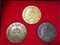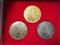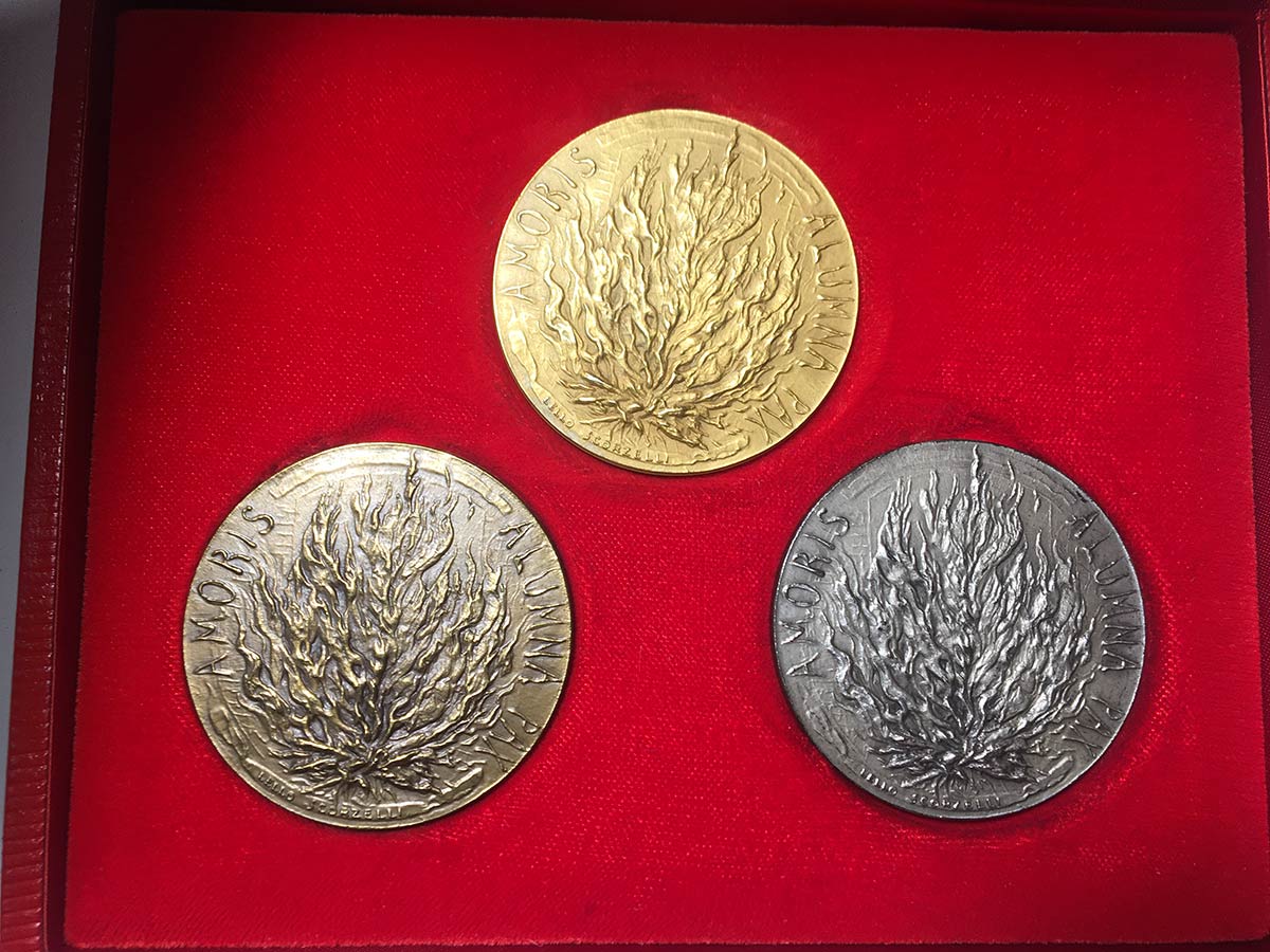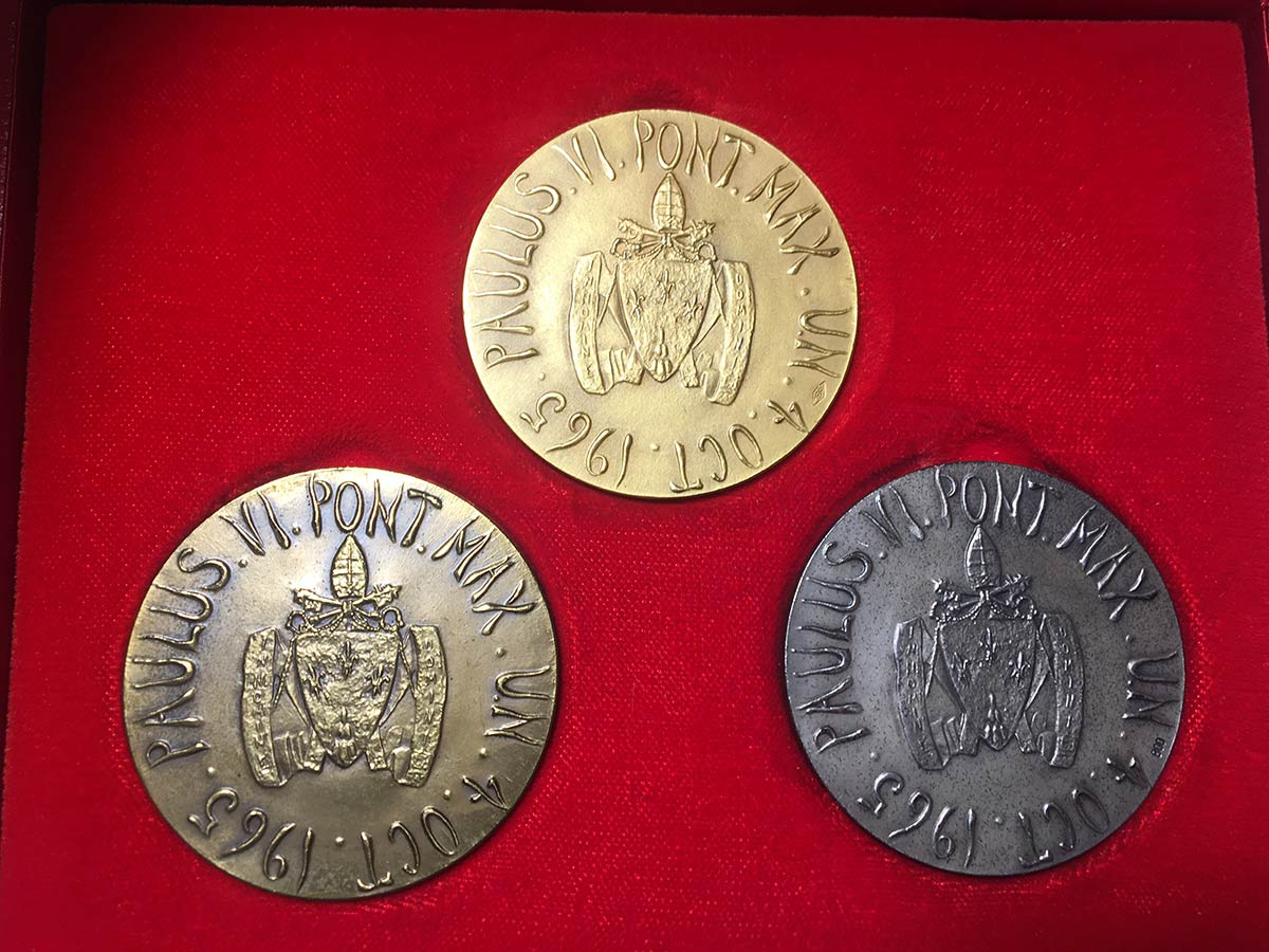 <br>ROMA. Paolo VI (1963-1978). Trittico in astuccio (AU, AR, AE) medaglie 1965 Visita all'O.N.U. D/Rogo ardente; R/ Stemma ed epigrafe. Opus Scorzelli. FDC