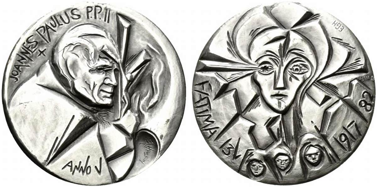 Lot 184 | <br>ROMA. Giovanni Paolo II (1978-2005). Medaglia ufficiale del V anno di pontificato 1982. Ag (47 g - 44 mm). Ritratto del sommo Pontefice. R/la Madonna di Fatima con i tre pastorelli. Con scatola. FDC