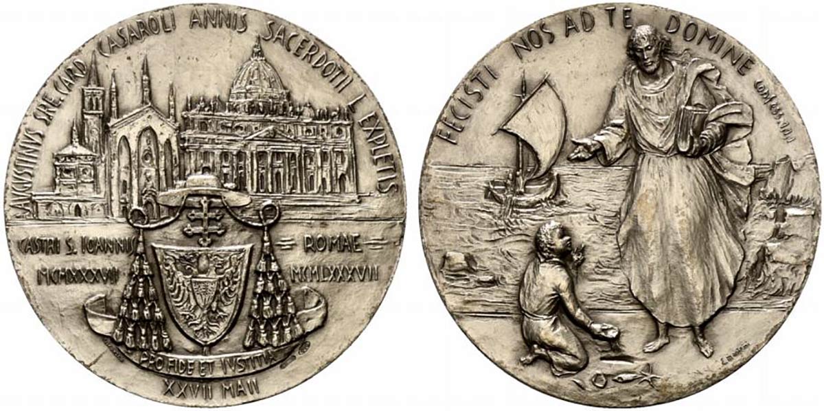 ROMA. Medaglia 50° anniversario del sacerdozio del Cardinale Casaroli 1987. Coniazione Johnson Opus Manfrini Ag (102 g - 60,5 mm). Scena delle Confessione di Sant'Agostino d'Ippona. R/Colleggiata di San Giovanni Battista e Basilica di San Pietro, in basso stemma cardinalizio. qFDC