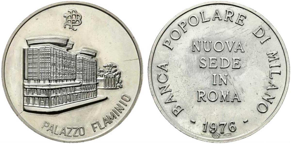 <br>ROMA. Medaglia celebrativa dell'inaugurazione in Palazzo Flaminio della nuova sede della Banca Popolare di Milano. Ag (23,9 g - 40,2 mm).