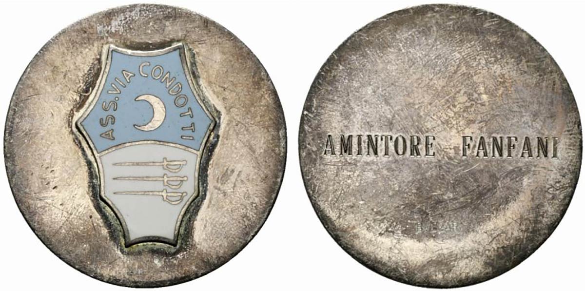 Lot 211 | <br>ROMA. Medaglia smaltata Associazione Via Condotti nominativa Amintore Fanfani. Firmata Bulgari. (28,2 g - 40 mm).