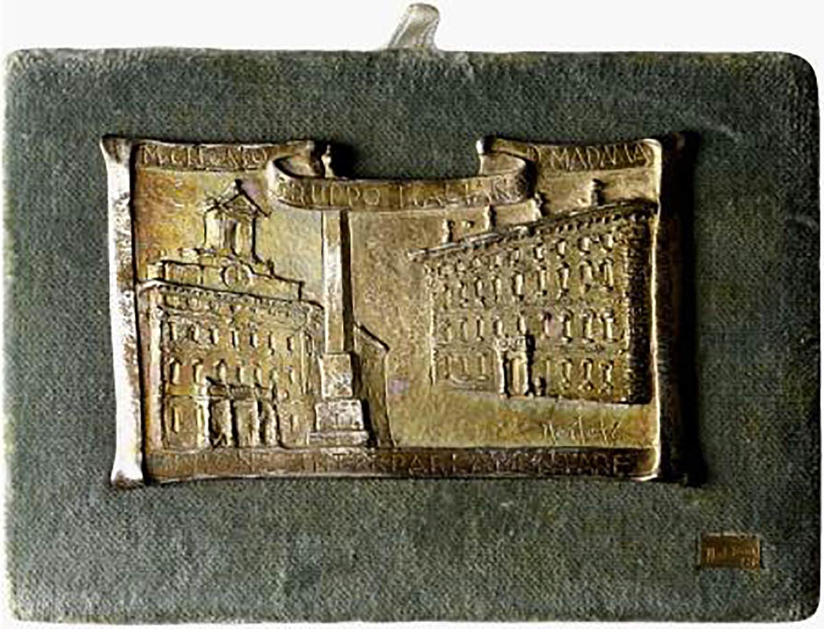 ROMA. Placca da tavolo in argento su base in velluto verde, raffigurante Montecitorio e Palazzo Madama. Misure placca 55x90, misure della base 90x125.