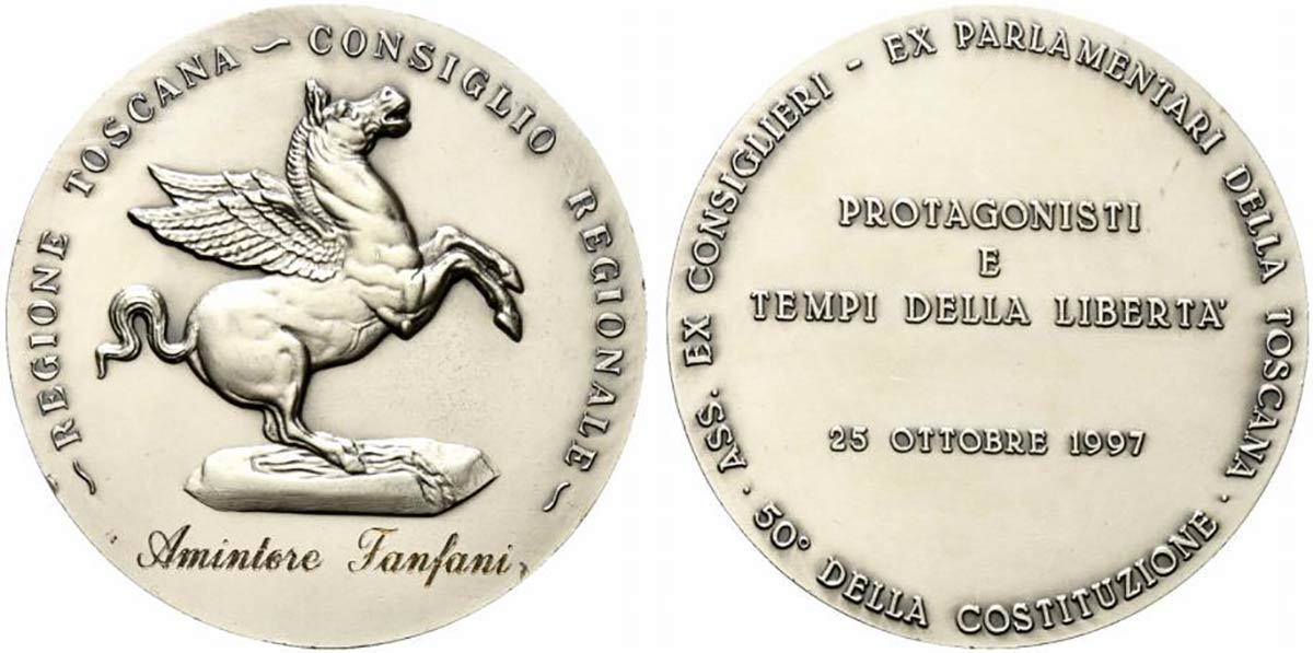 <br>TOSCANA. Medaglia 1997 CONSIGLIO REGIONALE con incisione ad Amintore Fanfani. Ag (110 g - 60 mm). qFDC colpetto al bordo.