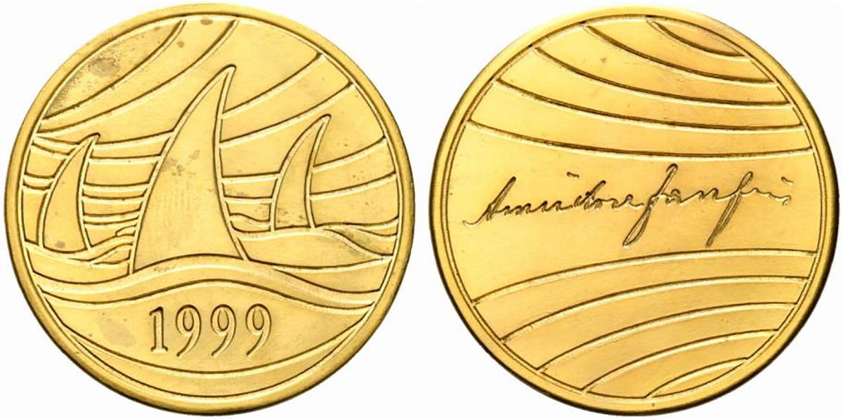 <br>AMINTORE FANFANI. Medaglia 1999 nominativa con cofanetto siglato A.F. metallo dorato (27 g - 45,89 mm).