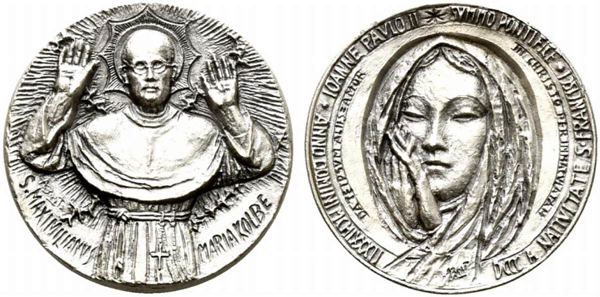 <br>S.MASSIMILIANO MARIA KOLBE (1894-1941). Medaglia Santificazione 1982 (Francescano Polacco, si offrì di prendere il posto di un padre di famiglia ad Auschwitz). Ag (39,5 g - 39,4 mm). FDC
