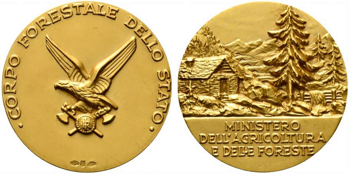 <br>CORPO FORESTALE DELLO STATO. Medaglia Ministero dell'Agricoltura e delle foreste. AU 0.750 (34,7 g - 39,6 mm). FDC