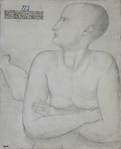 Nando Pierluca Fernandino (Venezia, 1912). Personaggio, 1971. Disegno a matita e tecnica mista su tela, firma in basso a sinistra e data in alto a sinistra. cm74x60