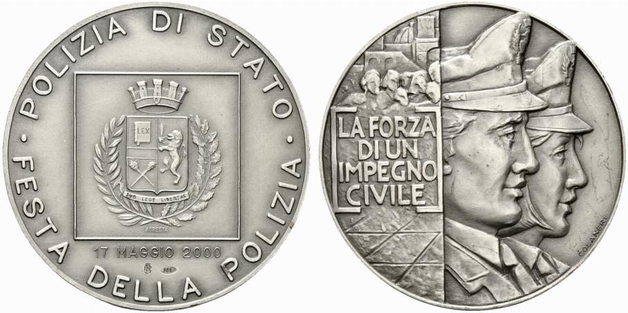 <br>POLIZIA DI STATO. Medaglia Festa della Polizia 17 maggio 2000. LA FORZA DI UN IMPEGNO CIVILE. IPZS opus Colaneri. Ag 0.986 (52,20 g - 50 mm).