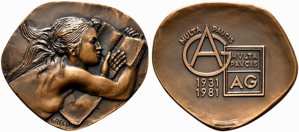 Lot 271 | <br>ASSICURAZIONI GENERALI. Medaglia cinquantenario 1931-1981. AE (176 g - 61x70 mm) Opus Greco. FDC
