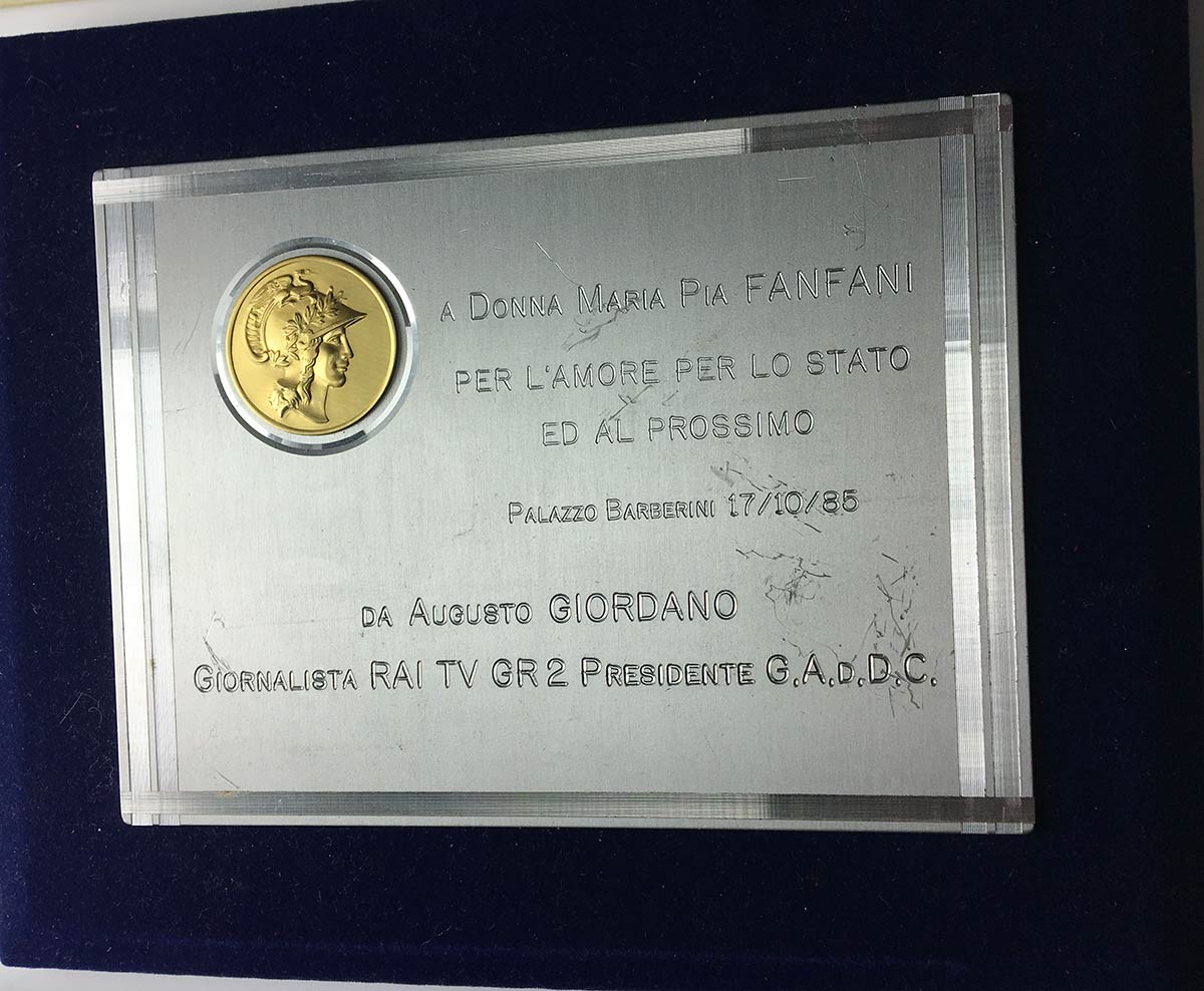 Placca da tavolo 1985 A Donna Maria Pia Fanfani "Per l'amore per lo stato ed al prossimo" da Augusto Giordano RAI TV GR2 (misura della placca 119x155 mm). Base in velluto blu.