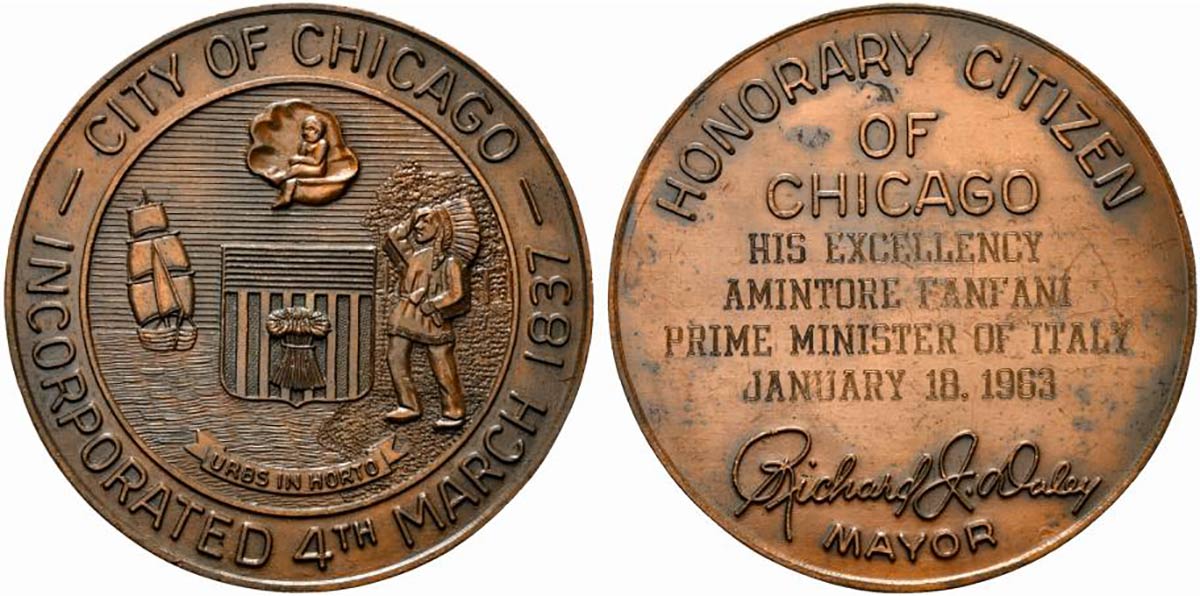 <br>STATI UNITI. Medaglia 1963 Cittadinanza onoraria della città di Chicago ad Amintore Fanfani. AE (217 g - 75,3 mm). qFDC