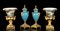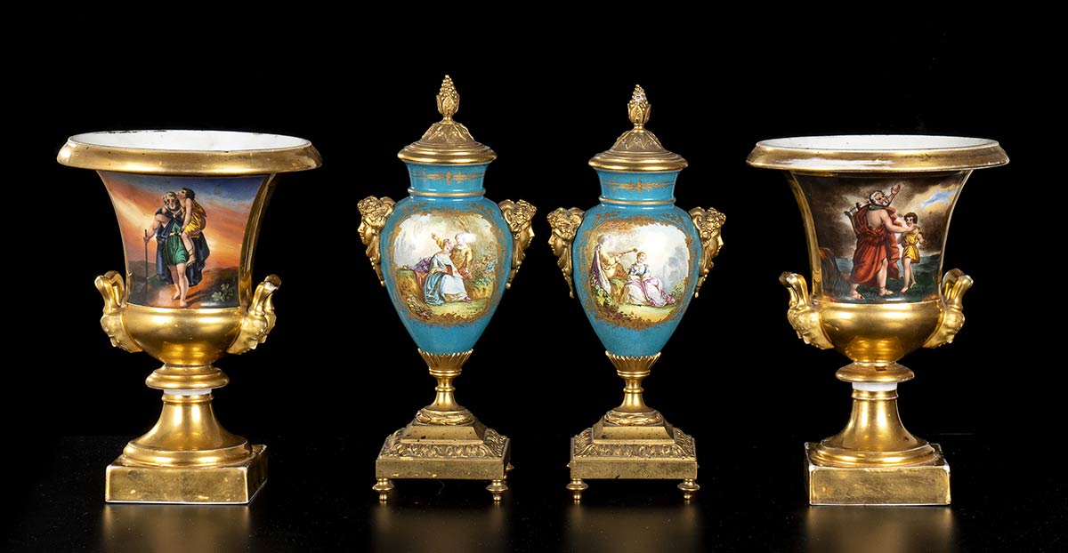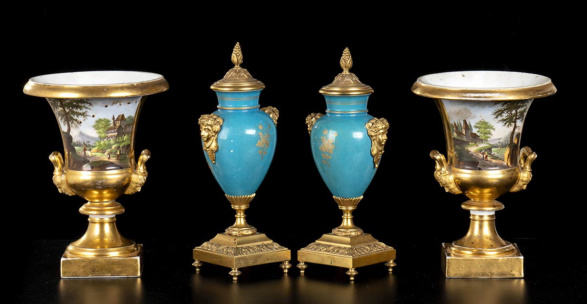 Due coppie di coppe e potiche in porcellana, due montate in bronzo, l'una stile Capodimonte , l'altra Sevres