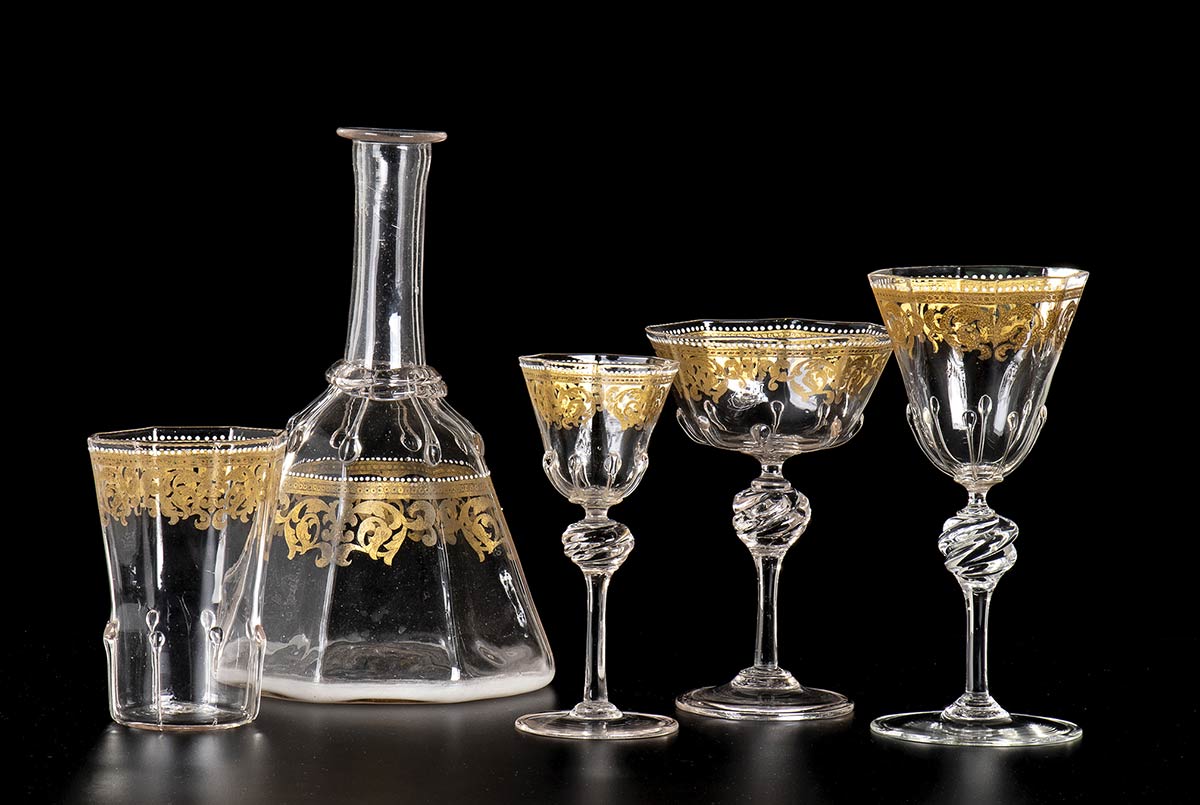 Servizio di bicchieri in vetro soffiato, Venezia, decorazione in oro zecchino e vetro colorato, calici da vino, calici da acqua, piccoli calici da vermouth, bicchieri da acqua e bottiglie (Totale pezzi 43)