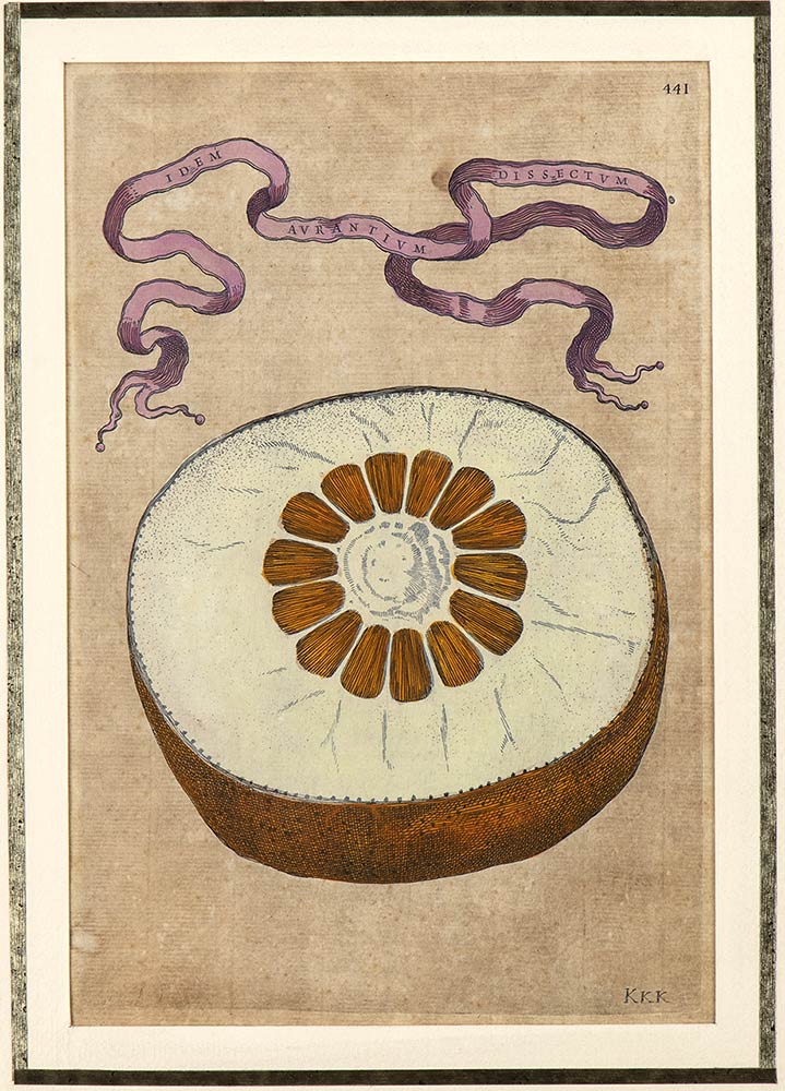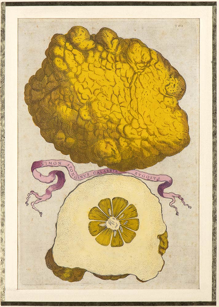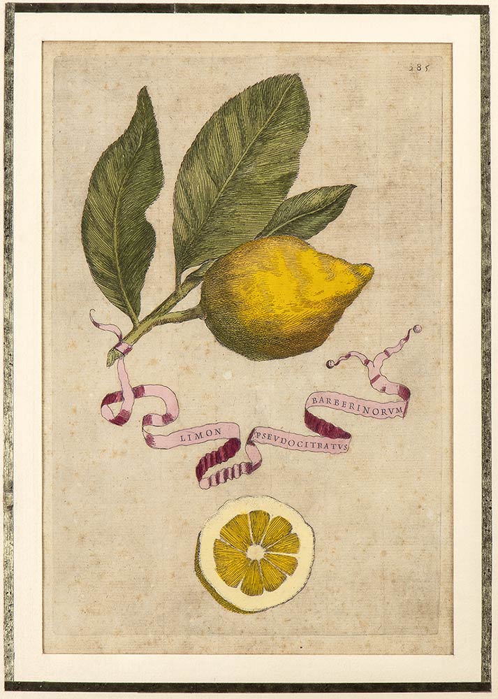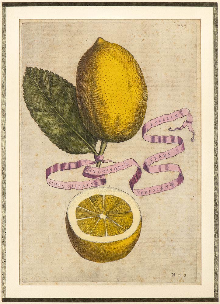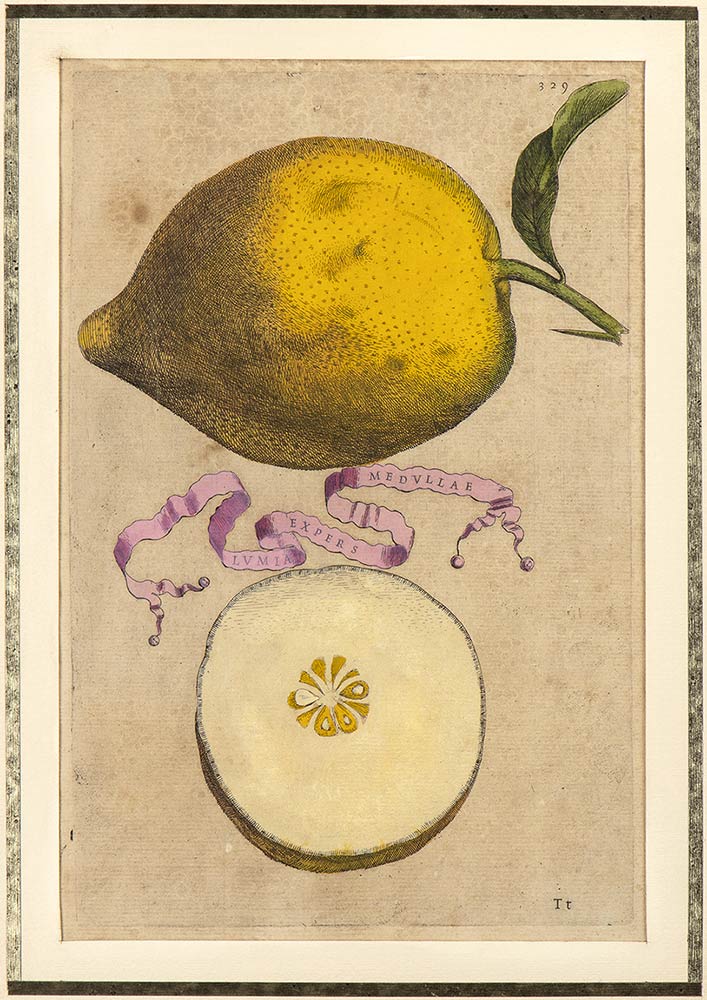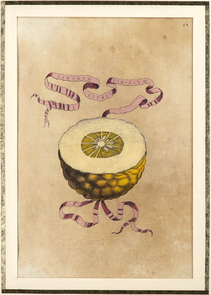 Sei incisioni su carta filigranata tratte da "Hesperides Sive de Malorum Aureorum Cultura et Usu Libras Quatuor" con studi di limone, 1646
